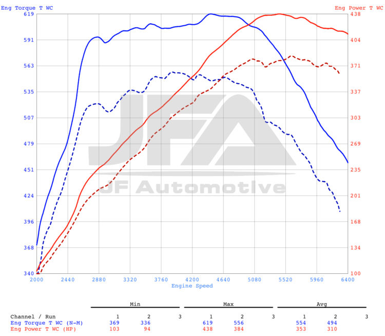 We record all power figures on our Mustang 2000BHP AWD linked dyno. This piece of kit measures wheel horsepower and torque. Factory estimated power figures are measured at the crank, and do not account for drivetrain percentage loss. For this reason, we apply our estimated drivetrain percentage loss to the wheel horsepower figures from our dyno to give us flywheel power.