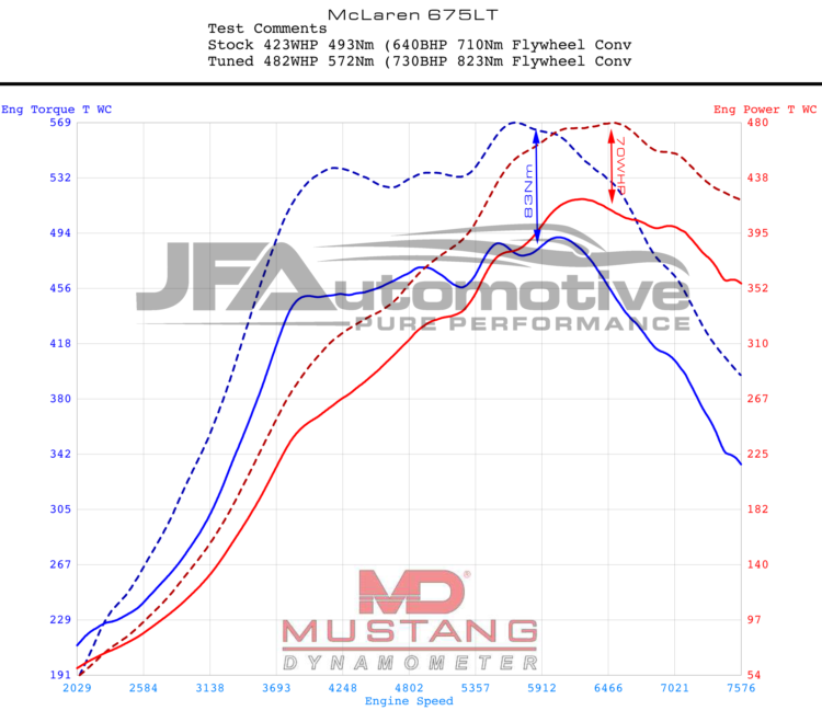 So we have been able to tune the McLaren 675LT to 730-740BHP and 820-830Nm – Please note the dyno graph on this page is power shown at wheels and such will be an drivetrain percentage loss to calculate.